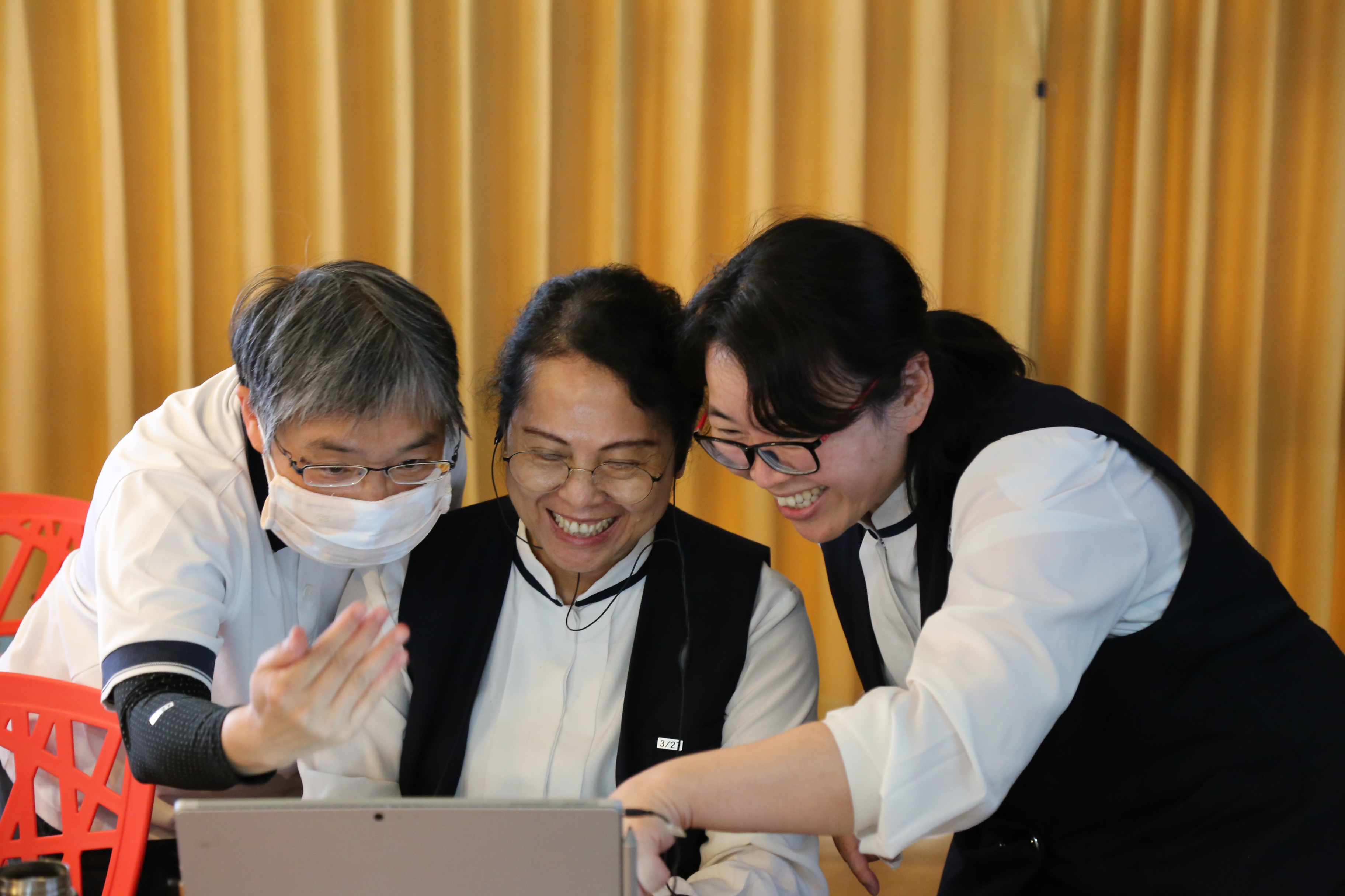 實體場與會者互相幫忙解決困難,一同學習和交流數位知識,提升科技在教學上的應用。